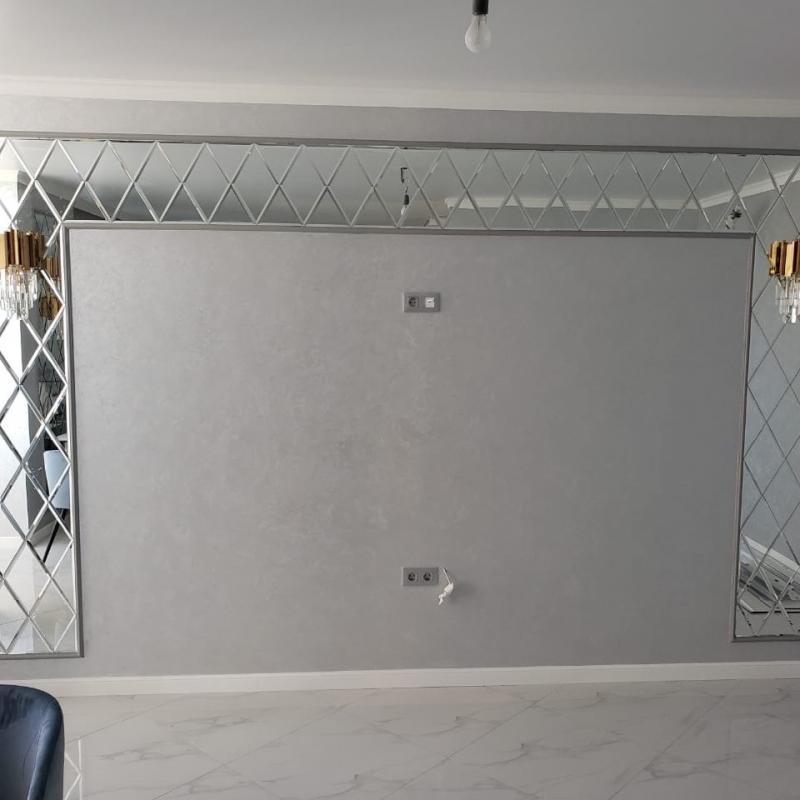 • Зеркальное панно в салоне, Москва, серебряная глянцевая плитка квадратной формы
